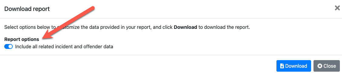 The download will have incident data, unless you choose to include offender data using the toggle show above.