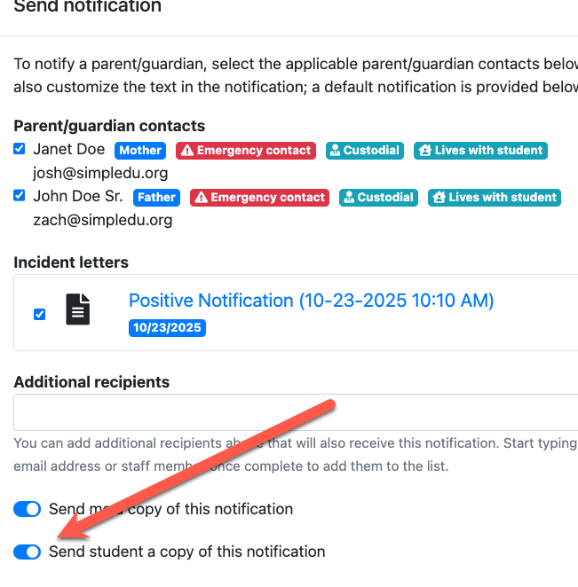 “Send student a copy of this notification” toggle is turned on.