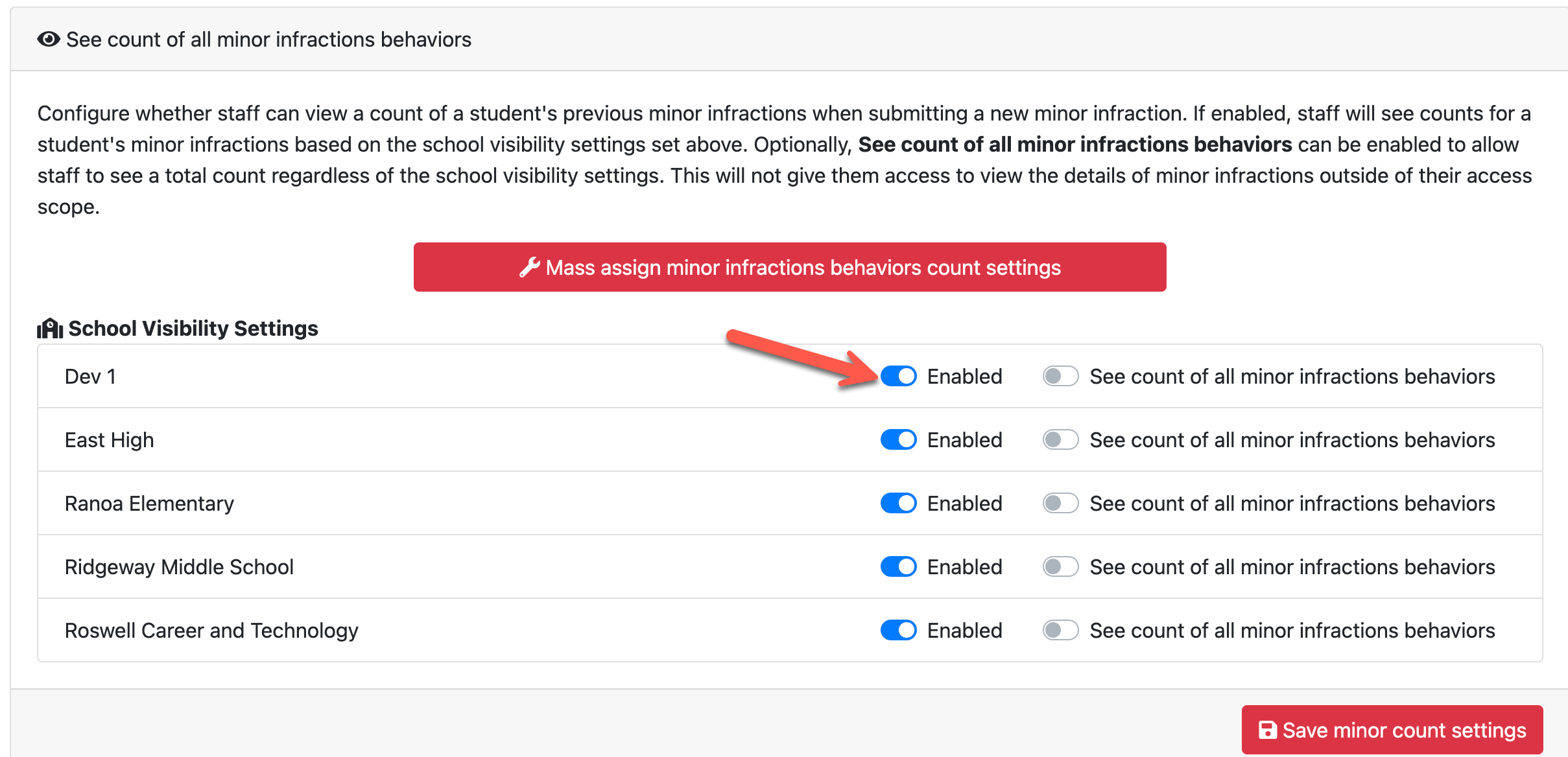 This option is recommended for schools using a progressive discipline matrix based on cumulative minor infraction counts while still protecting student privacy. When minor infraction visibility is enabled in the section above, it overrides the settings here and permits teachers to view minor infraction details.