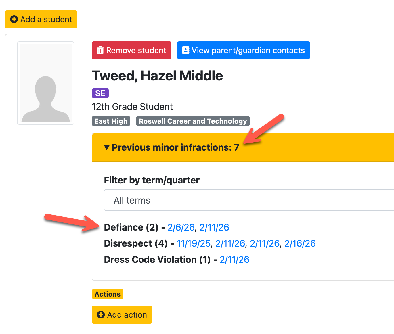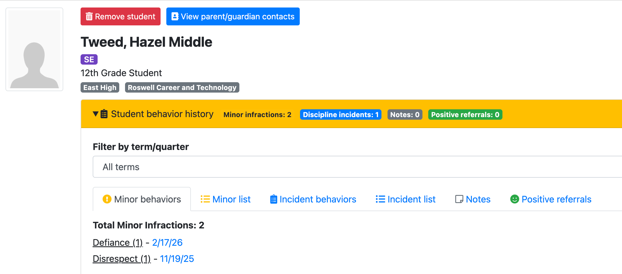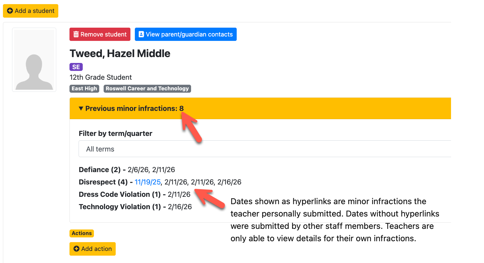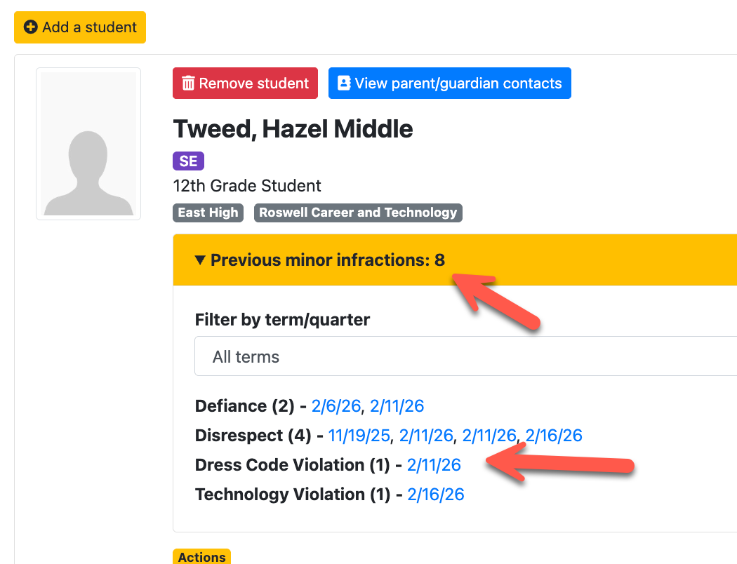 In this configuration, teachers can see the complete history of minor infractions for the student, including details entered by other staff members.