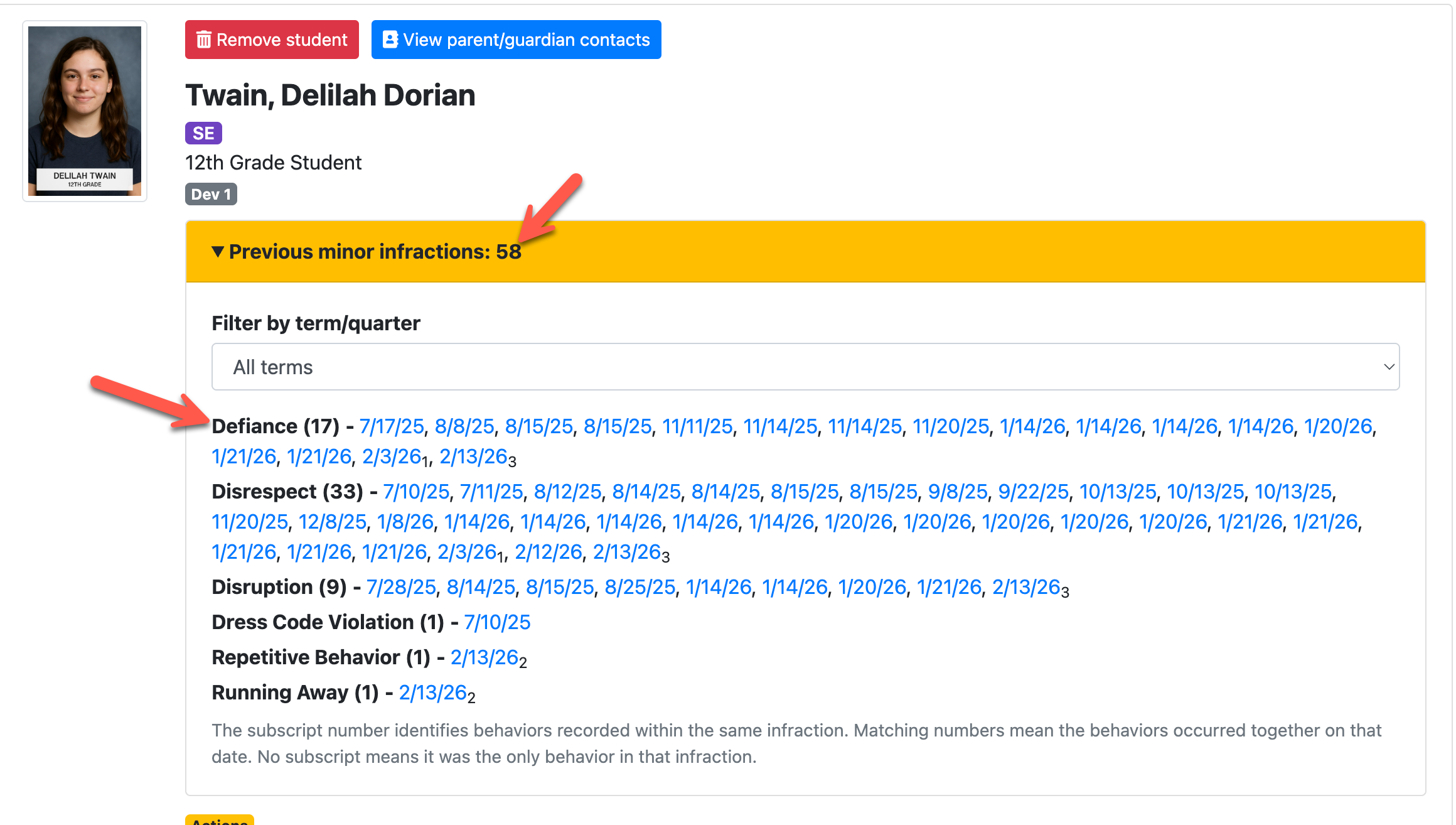 •Provides clickable dates that open the full infraction record, regardless of who documented it