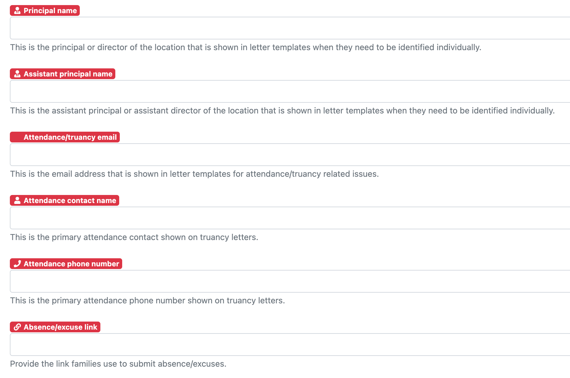 These fields are tied to the letter variables used in attendance and truancy documents. Updating the location fields ensures that all letters using those variables will display the correct school-specific contact information.