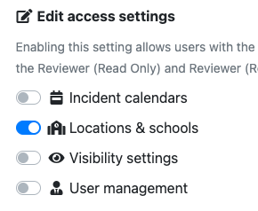 When a toggle is off, users with the Reviewer role can view the information on these pages but will have read-only access and cannot make changes. When a toggle is enabled, users with the Reviewer role can edit these pages. Access is restricted to the locations associated with their elevated role.