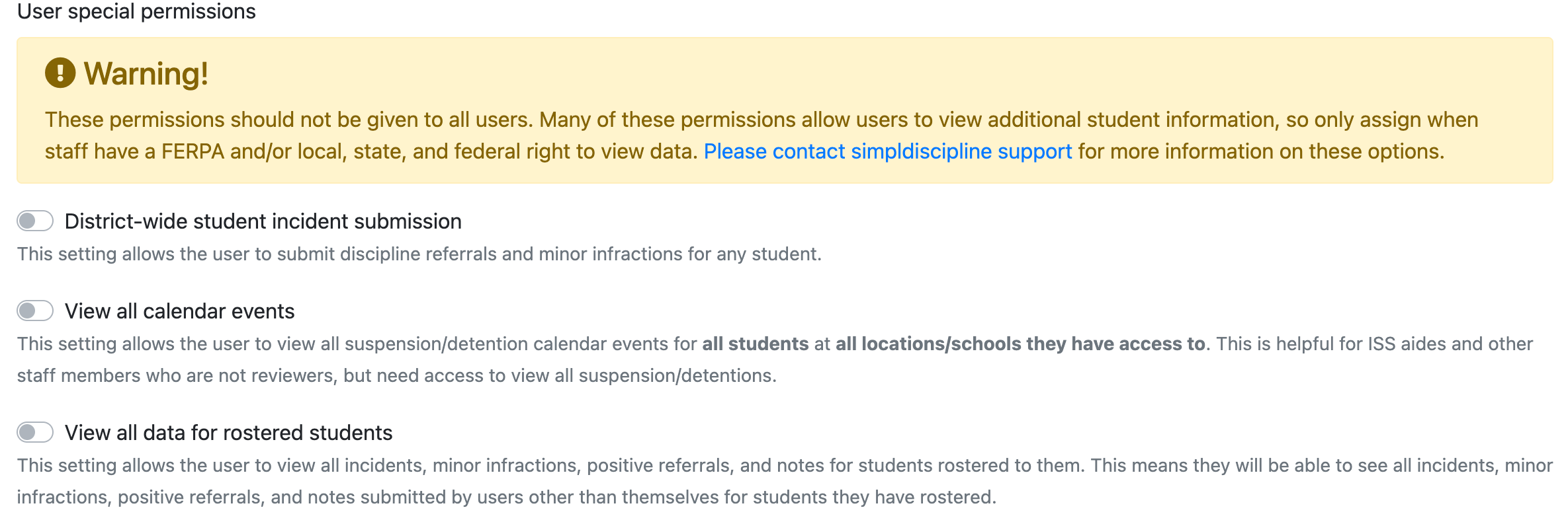 View all data for rostered students: This setting allows the user to view all incidents, minor infractions, positive referrals, and notes for students rostered to them. This means they will be able to see all incidents, minor infractions, positive referrals, and notes submitted by users other than themselves for students they have rostered. This should be used with you want to grant individual teachers this ability versus turning on incident visibility for all teachers.