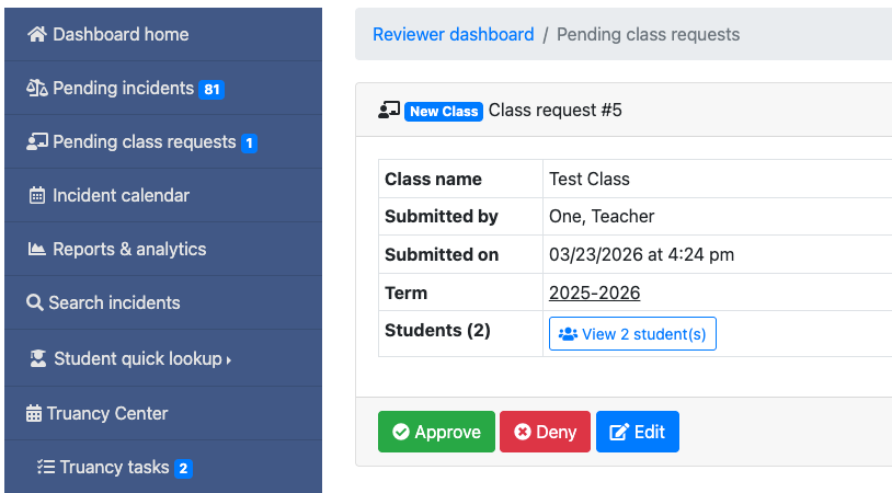 To approve these requests, navigate to the Reviewer Area and select Class Approvals from the left-hand navigation menu.