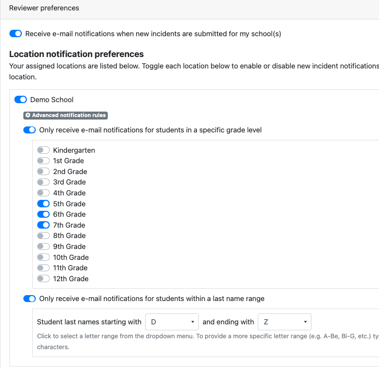 Note: You can choose to use either the grade level or last name range settings—or both. If you’d like to receive email notifications for incidents involving students in a specific grade and within a specific last name range, configure both settings accordingly. Keep in mind, Individual Student Notifications are always sent, regardless of any grade level or last name filters you’ve set.