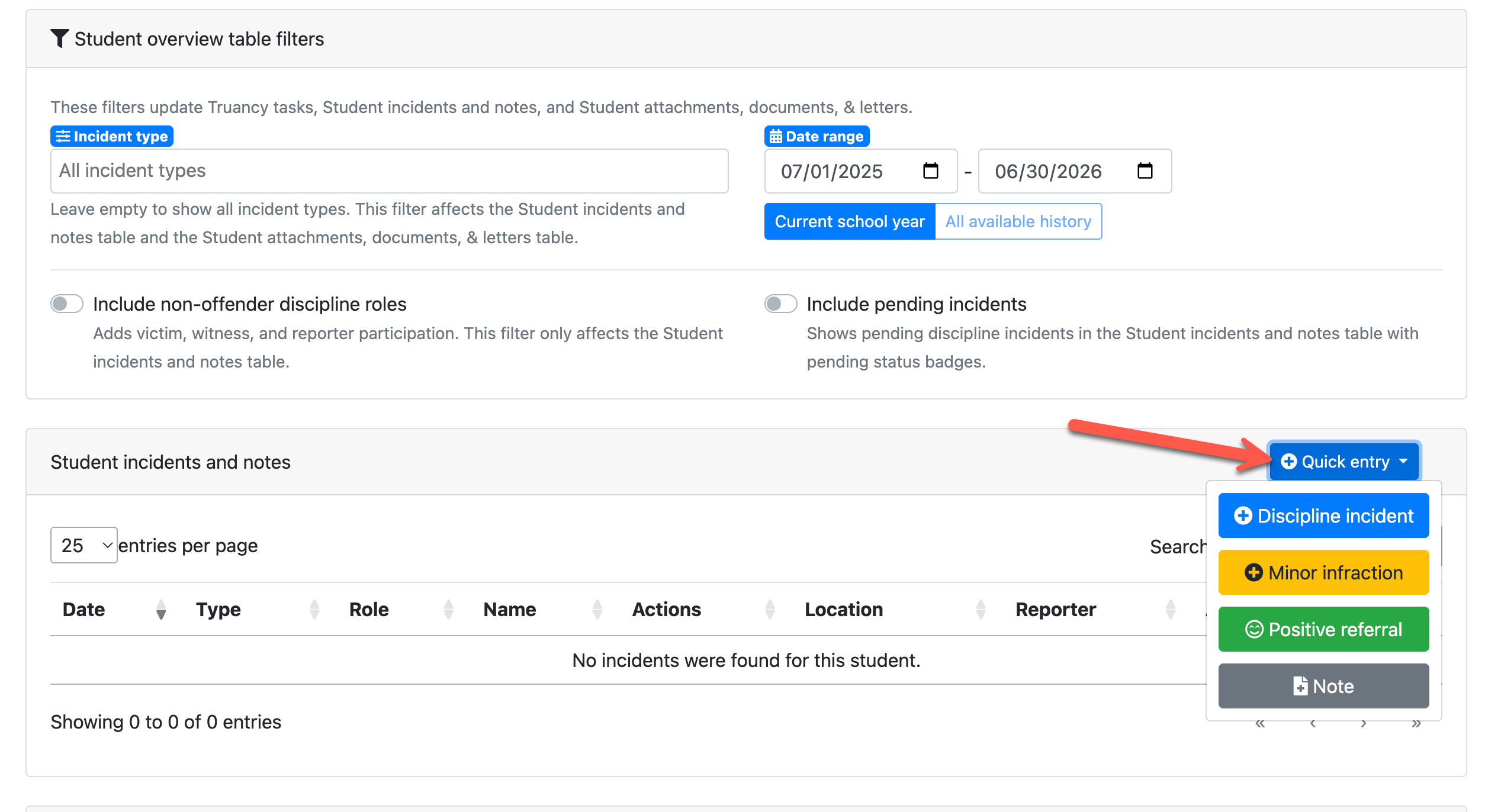 You can still add minor infractions, positive referrals, and notes for inactive students. However, this must be done from the Student Overview page using the Quick Entry option. From there, you can select Note and enter the needed details.