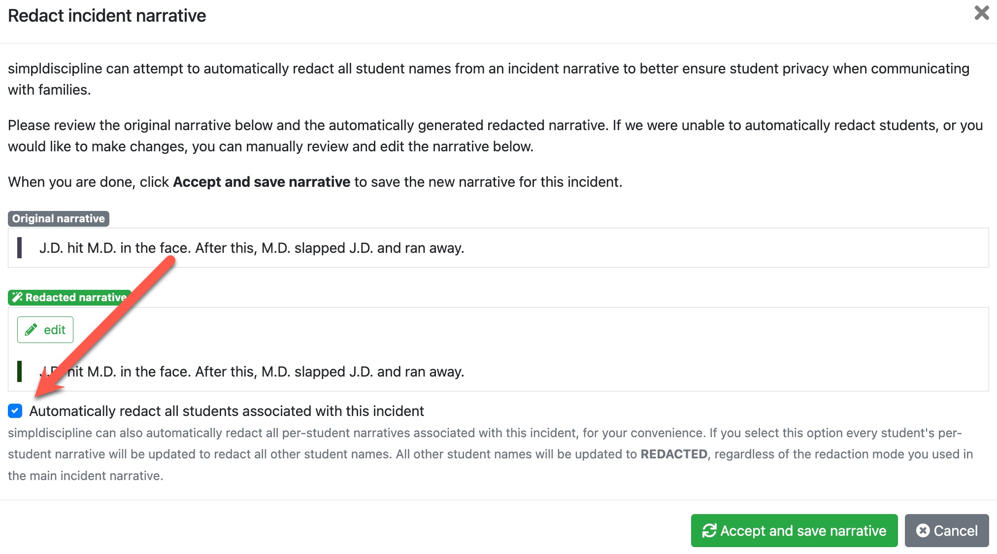 Administrators can automatically redact student names within incident narratives. The system matches names exactly to the student’s legal first or middle name as stored in your student information system. If a name does not match exactly, it will need to be manually updated in the incident narrative.