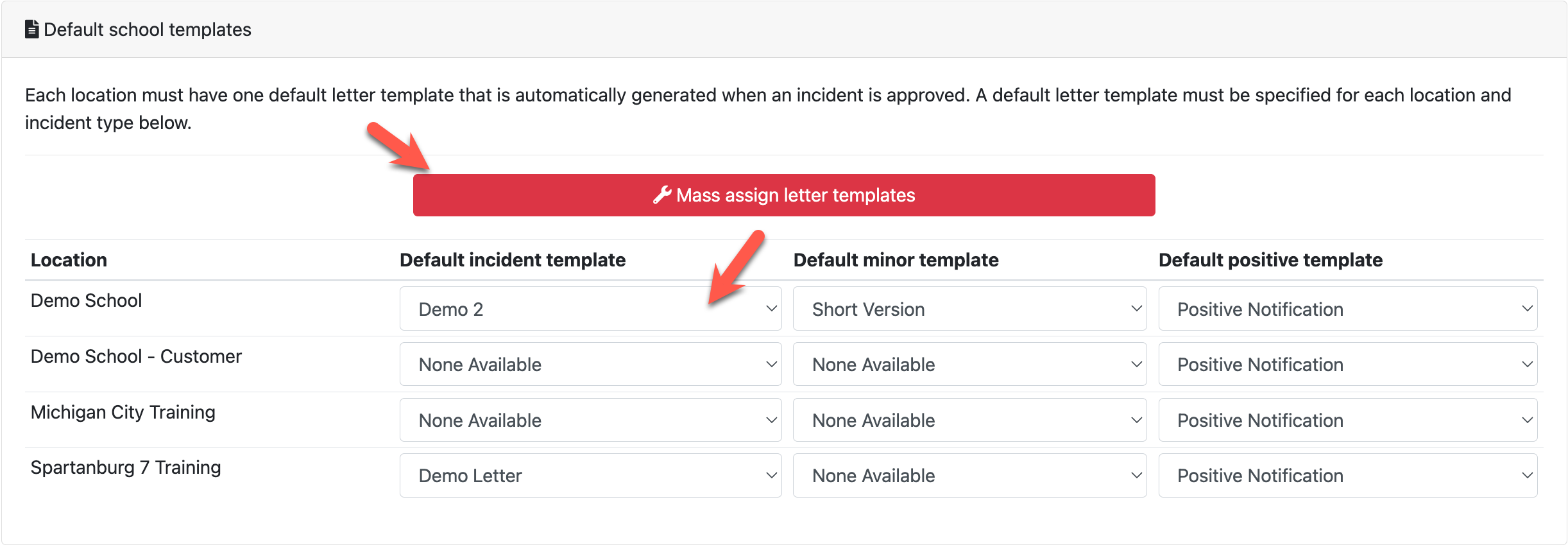 Super Administrators can select default letter templates directly within the user interface. When viewing letter templates in the Admin area, users can designate a default template for discipline incidents, minor infractions, and positive referrals. These defaults can be set for each school location, ensuring consistency in communication across the district.