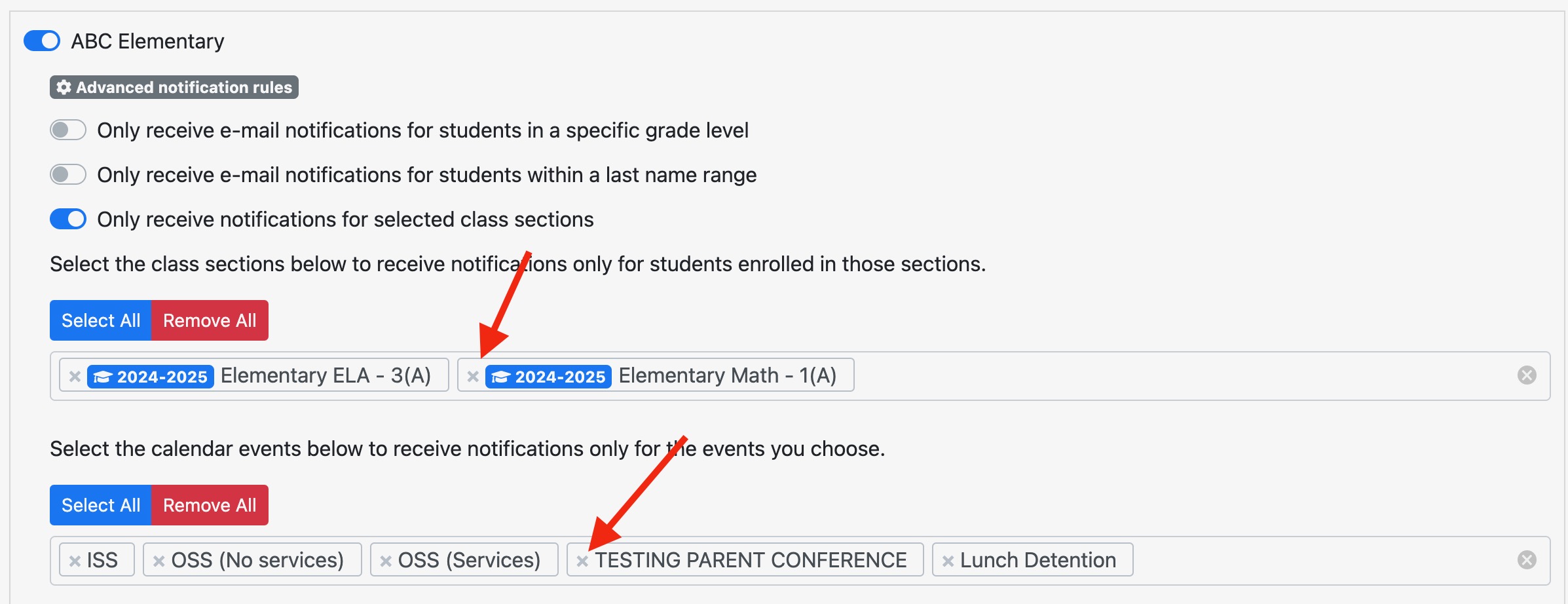 Filters based on grade level or last name range take priority over course section preferences. For example, if a user chooses to receive notifications for the English course but sets their preferences to only receive emails for students with last names beginning with S–Z, they will only receive notifications for John Smith—not Jane Doe—even though both students are enrolled in the same course. Jane Doe would be excluded because her last name falls outside the specified range.
