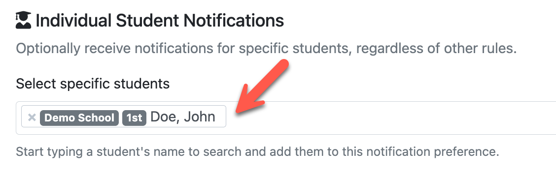 This filter can be used on any of the components listed above. Use this filter to receive notifications for specific students, regardless of any other filters you’ve applied. Simply search for and add the students you want to monitor. This is especially helpful for counselors, administrators, or staff who need to keep a closer eye on certain students or who mentor students outside their assigned grade or age range. Notifications for students added here will always be sent, even if they fall outside your other selected filters.